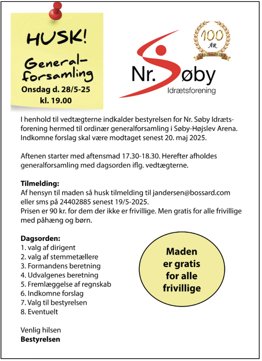 Dato 28 maj 2025 Expired! Tid 19:00 Nr. Søby If – Generalforsamling 2025 + Add to Google Calendar + iCal / Outlook export